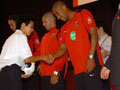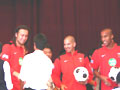 本日、27日(水)12時15分から、大原サッカー場の隣の大原中学校体育館で贈呈式が行われ、藤口代表、ネネ、闘莉王、エスクデロの3選手が出席しました。