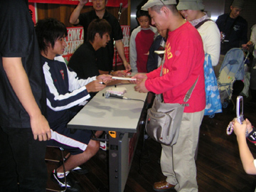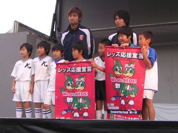 近藤・小池からは地元の少年団の子供たちに対して、サイン入りのチームフラッグをプレゼント。そのお礼として、2人には「レッズ応援宣言」という大きなロゴの入ったペナントが手渡されました。その後、抽選会にも参加した後、「ダヴ」地下1階に設けられている「浦和レッズ応援宣言特設会場」に場所を移して、サイン会へ。2人は約150人のファン・サポーターの方々にサイン、記念写真の撮影なども行なっていました。最後は集まった方々と握手も交わし、2人が参加したイベントは盛況のうちに終了となりました。