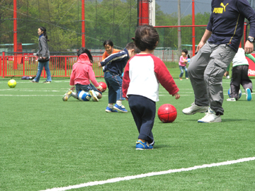 「この状態で植え付けたとしても作物の出来に影響が出てしまいます。残念ですが今日は勇気ある決断です」とJAさいたま・小山寛課長。急遽、人工芝フットサルコートを開放、参加者の方たちは、空いた時間を親子でボール遊びを楽しんだ。
