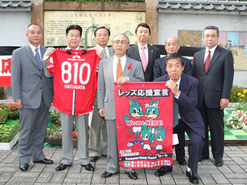 その後、沼口商工会長と木下達則鳩ヶ谷市長から、式に参列した藤口光紀代表へ、「浦和レッズ応援宣言書」が手渡されました。宣言書には、「鳩ヶ谷市は、浦和レッドダイヤモンズの本拠地埼玉スタジアムの至近に位置し、レッズに対して地元意識を持ち、真に浦和レッズの活躍を願っています」と記されていました。