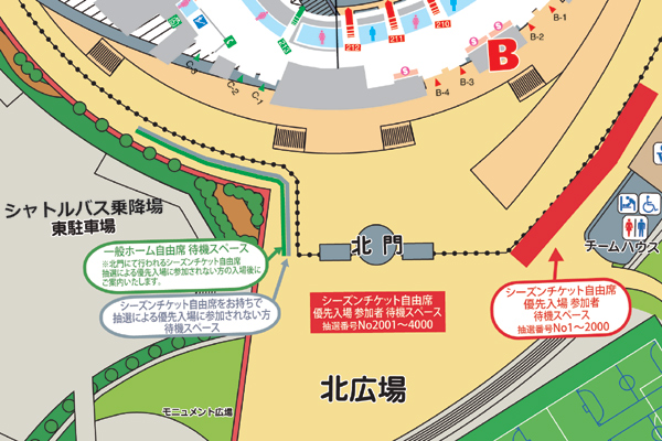 ・シーズンチケット以外のホーム自由席をお持ちの方は、キックオフ5時間前(14時30分)に列整理を行います。北門もしくは南門付近に設置された一般ホーム自由席待機スペースにお越しください。
