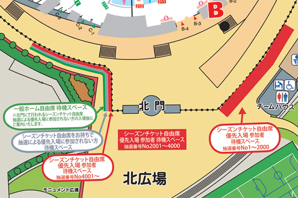 ・シーズンチケット以外のホーム自由席をお持ちの方は、キックオフ5時間前(9時00分)に列整理を行います。北門もしくは南門付近に設置された一般ホーム自由席待機スペースにお越しください。
