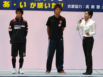 次に、高崎はけやき広場内の舞台に、大宮アルディージャの渡部大輔選手、マスコットのアルディとともに登場しました。「浦和レッズの高崎寛之です。背番号は26です。今レッズはちょっと調子がよくないですが、必ず優勝するので応援よろしくお願いします」と自己紹介し、会場からの拍手を浴びていました。挨拶の後、渡部選手、アルディと一緒に、子供たちと舞台上でパス回しを実演しました。