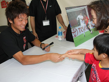 その後、レッズのブースに移動、サイン会を行ないました。およそ100人ほどのファンの方に色紙やポストカードにサインをしたり、写真撮影をしてイベントは終了しました。