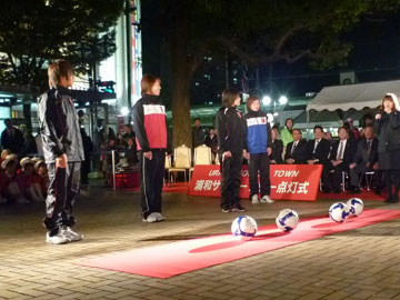 その後、地元の仲町少年サッカー団、岸町少年サッカー団、高砂少年サッカー団の子供たち、そしてレッズレディースの4人と内舘も、エアゴールに向けてシュート。ゴールが決まるたびに、イルミネーションが順次、ともされていった。締めくくりに小林敏さいたま副市長がゴール。すべてのイルミネーションが点灯された。
