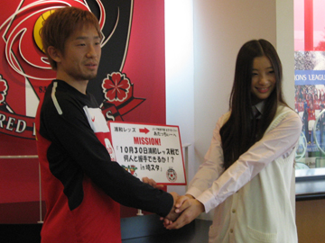 初めてレッズのホームゲームを訪れる足立さんは「サポーターの皆さんの応援がすごい印象に残っています。見ていて、あそこで一緒に応援したら、面白いだろうな、自分も盛り上がるだろうなと思っていたので楽しみにしています。皆さんと握手ができるようにしたいので、私を見かけたらいつでもいいので、お声をかけてください」とコメント。宇賀神とがっちりと握手を交わし、ミッションの成功を誓っていました。