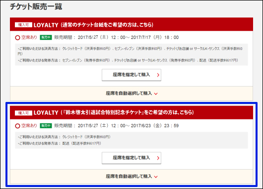 ※当試合での同席種・同席番をご購入できるシーズンチケットホルダー優先販売の実施はございません。