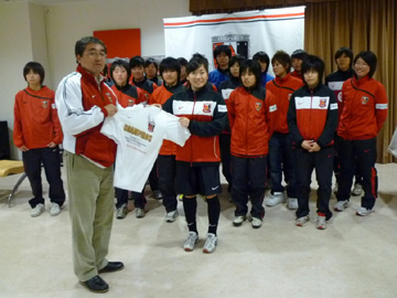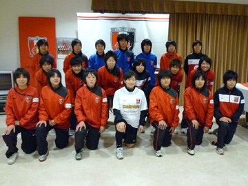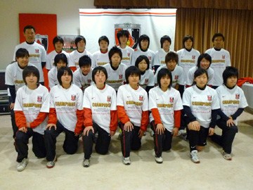 [アカデミーセンター]10日、レッズランドクラブハウスにて、浦和レッズジュニアユースレディースU-18のメンバーに優勝記念Tシャツの贈呈式が行なわれた。