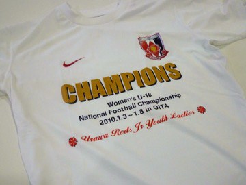 ジュニアユースレディースは1月に大分で行なわれた『JOCジュニアオリンピックカップ第13回全日本女子ユース(U-18)サッカー選手権大会』にて初優勝。Tシャツはその栄冠を記念して、レッズのオフィシャルパートナー、ナイキ・ジャパンから、クラブエンブレムと、金に輝く「CHAMPIONS」の文字、大会名を入れて限定制作され、この日、選手・スタッフだけに手渡されることになった。