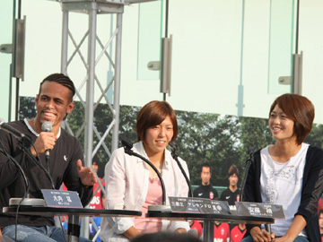また15時から浦和PARCO前市民広場に場所を移して行なわれた公開生放送には、三都主 アレサンドロ、浦和レッズレディースの柳田美幸、安藤 梢が出演しました。ステージに3人が登場すると、会場に集まった約300人から大きな拍手で迎えられました。3人はお互いのプレーの印象や、現在のそれぞれの状況についても語りあいました。レッズレディースの2人は10分ほどで一時、ステージを降り、その後はアレックスがリハビリの状況や家族のこと、そして2週間ほど前に誕生した2人目の愛娘についても語っていました。
