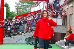 5月5日こどもの日、大原サッカー場にはたくさんの親子連れが見学に訪れていた。クラブハウスの見学スタンドを中心に約600人、サッカー場を囲むフェンス沿いにも約200人が立ち、選手たちを見守った。練...