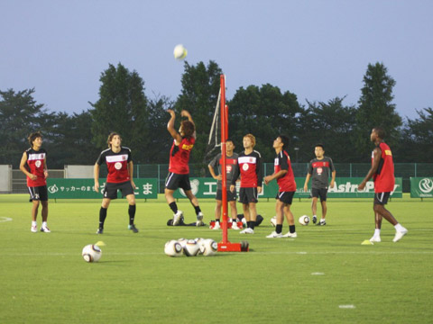 給水休憩を挟んでから、サーキットトレーニングへ。リフティング、ドリブル、80パーセントまでの加速走、ジョギング、バックステップをそれぞれピッチの所定の位置でこ...