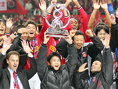 サポーターの「浦和レッズ カンペオン」の合唱の中、いよいよアジアの頂点に立った証、優勝カップを掲げるときが来た。ピッチに表彰台が設置され、AFCの役員が登壇する。華やいだ空気に包まれ、表彰式が始まった。