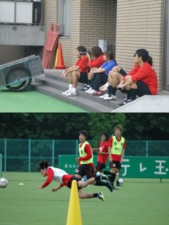 9日の練習終了後、クラブハウスの入り口付近に腰掛けて、サテライトチームの練習を眺めていた永井と高原。スタッフの望遠レンズ付きデジタルカメラに興味をもった2人は、「ちょっとそれ貸して」と言って...