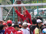 快晴のGWとあって、大原練習場には1200人ほどもの見学者が訪れた。フットサル場は子供たちに開放され、レプリカユニフォームを着た子供たちが持参のボールで遊んでいた。その様子を見て、フットサル場に足を向けたのがクールダウンを終えた闘莉王。突然の訪問に子供たちは大喜び、闘莉王はあっ...